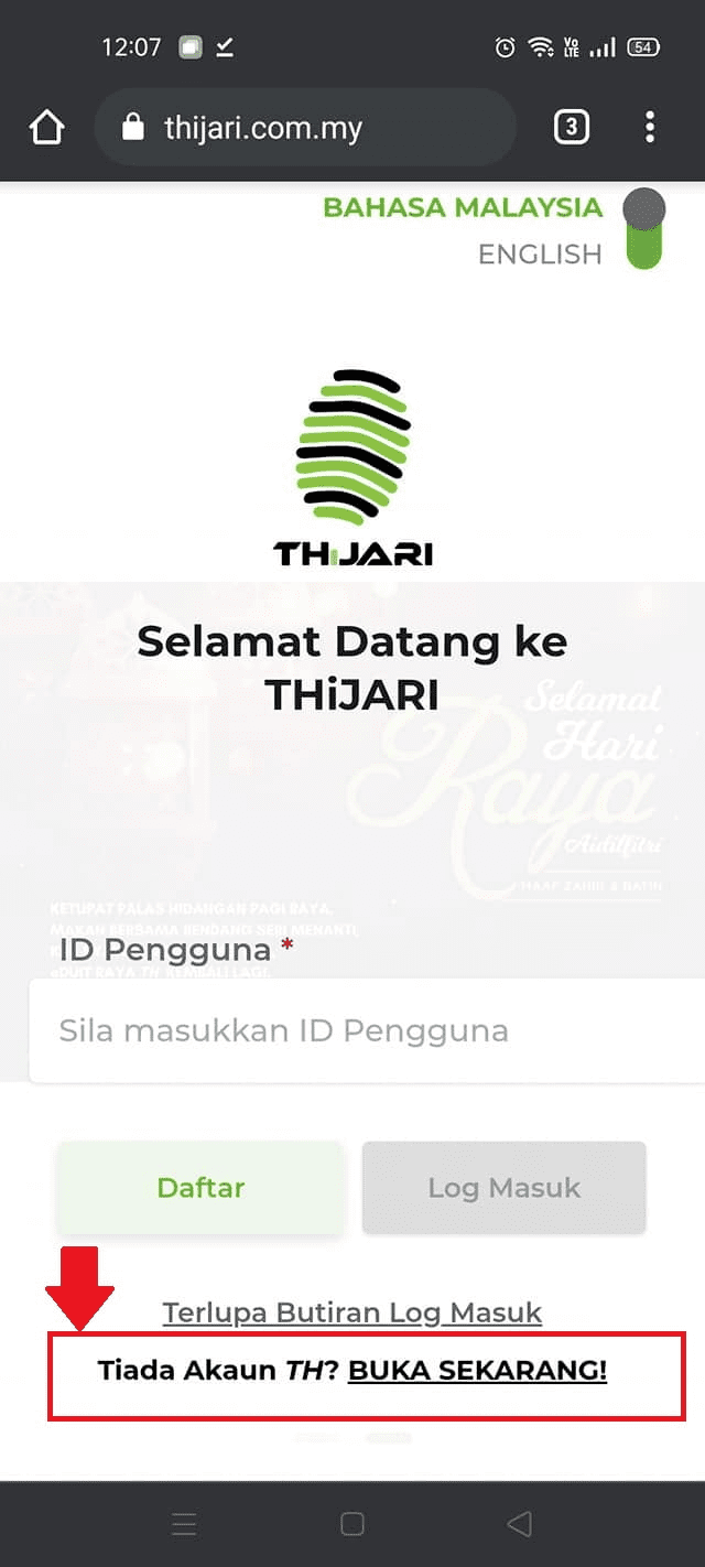 2. Klik pada ‘Tiada akaun TH? BUKA SEKARANG!”