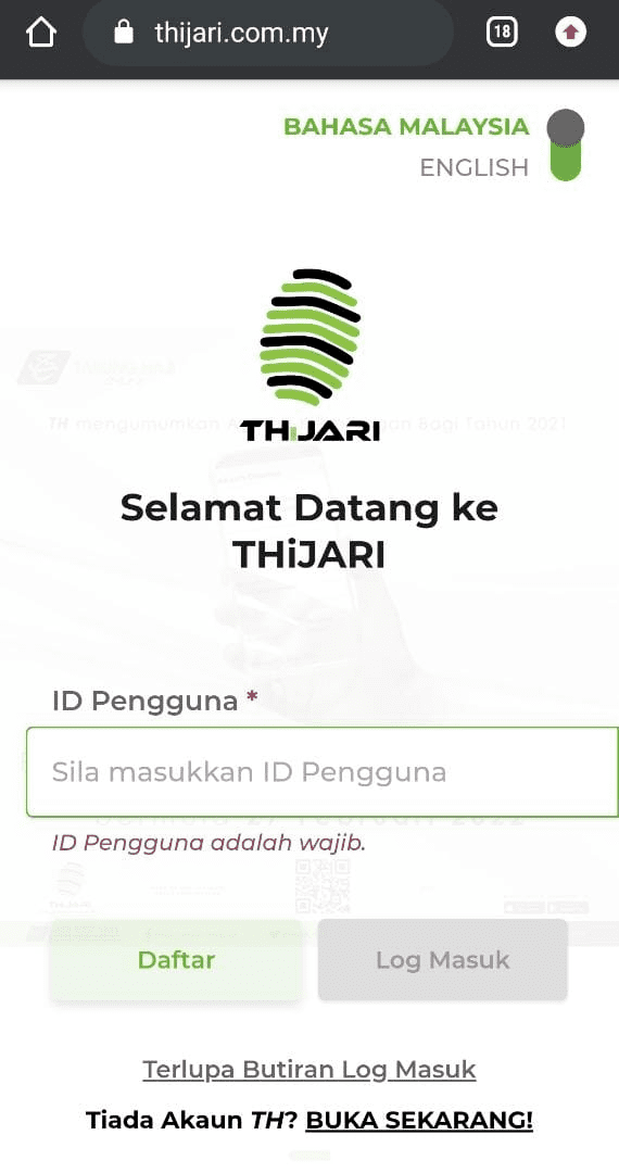 1. Layari portal atau aplikasi THiJARI seperti pautan di atas