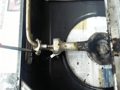 Ambil spray anti karat dan semburkan ke dalam bahagian penyambung antara tungku dan injap gas. Lalu gunakan klip kertas untuk mencucuk lubang halus di injap gas.