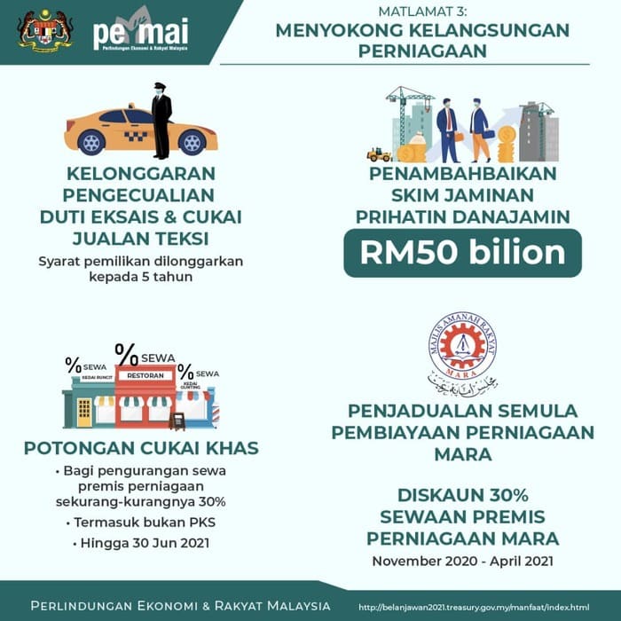 50% jaminan ke atas pinjaman akan disediakan bagi bas dan teksi yang terpilih, membuatkan mereka boleh nikmati moratorium sehingga 12 bulan dan pembayaran balik bulanan yang lebih rendah. Ini pastinya membantu golongan pembawa bas dan teksi yang tiada pendapatan atau berkurangan sepanjang tempoh PKP ini.