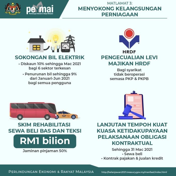 Kerajaan akan melanjutkan tempoh kuat kuasa ketidakupayaan untuk melaksanakan obligasi kontraktual hingga 31 Mac 2021. Ini termasuklah perjanjian sewa beli atau kontrak pajakan dan kontrak jualan kredit untuk memanfaatkan golongan yang terjejas seperti golongan B40, M40 dan perusahaan mikro kerana gagal memenuhi obligasi kontrak mereka