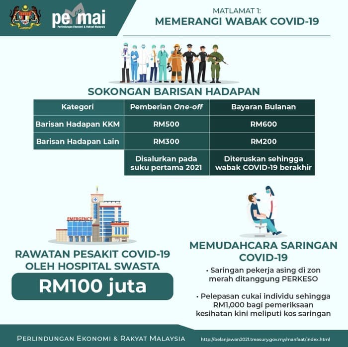 Selain daripada penglibatan PERKESO dalam Program Ujian Saringan Covid-19 ke atas pekerja asing. Kos saringan akan ditanggung sepenuhnya oleh PERKESO di zon-zon merah bagi mengenal pasti kluster COVID-19 di tempat kerja. Kerajaan juga akan meningkatkan jumlah pelepasan cukai bagi perbelanjaan pemeriksaan kesihatan penuh daripada RM500 kepada RM1,000 yang meliputi bayaran ujian pengesanan COVID-19. Jadi kita boleh lah buat ujian saringan COVID-19 dan dapat pelepasan cukai.