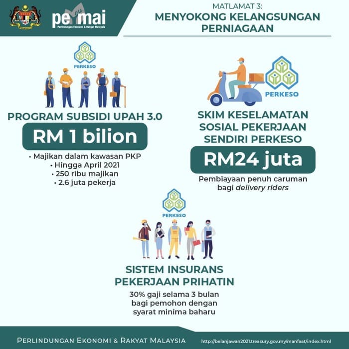 Program Subsidi Upah 3.0 di bawah PERKESO akan ditambah baik, di mana majikan yang layak akan menerima subsidi upah sebanyak RM600 bagi setiap pekerja yang bergaji kurang daripada RM4,000. Had permohonan akan dinaikkan sehingga 500 orang pekerja. Dengan adanya ini pasti syarikat akan kurang bebean untuk membayar gaji para pekerja dan seterusnya tidak membuang pekerja.
