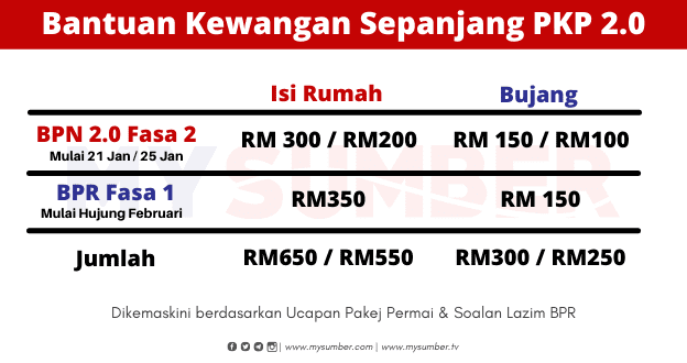 Bayaran fasa terakhir Bantuan Prihatin Nasional 2.0 akan dipercepatkan iaitu mulai 21 Januari 2021. Bagi bayaran fasa pertama Bantuan Prihatin Rakyat (BPR) pula, golongan isi rumah akan menerima RM300, dan bagi kategori bujang akan menerima RM150