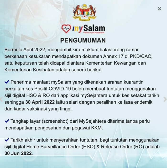Nota: Sebagai rujukan, tuntutan berkaitan kuarantin berkaitan kes kontak rapat (di mana diagnosis COVID-19 adalah negatif) hanya diterima bagi tarikh kuarantin hingga 31 Oktober 2021 dan tuntutan perlu dikemukakan selewatnya pada 31 Disember 2021. Sebarang tuntutan berkaitan kuarantin di rumah selepas tarikh 31 Disember 2021, hanya akan diterima bagi diagnosis positif COVID-19. Makluman berkenaan perkara ini juga telah dibuat di laman web mySalam, sejak 12 Oktober 2021.