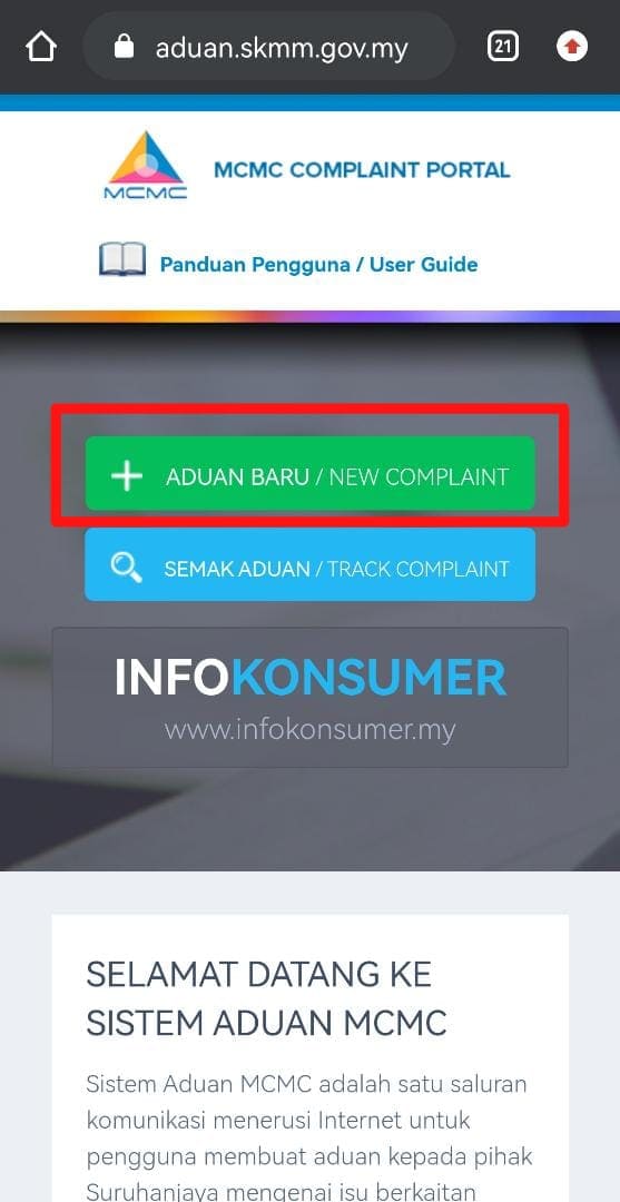 2. Klik ‘Aduan Baru’ dan isi maklumat berikut: