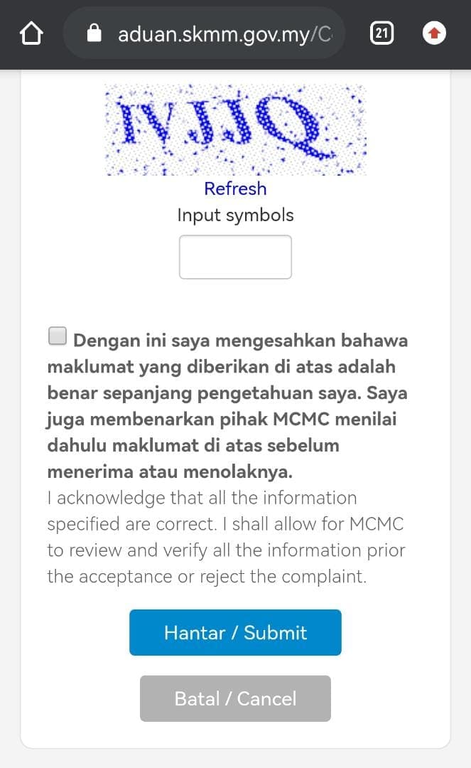 7. Masukkan Kod Captcha, tandakan pada bahagian pengesahan dan klik Hantar / Submit