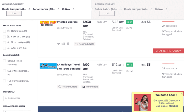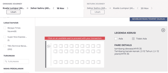 4. Pilih masa yang diinginkan dan syarikat bas yang ingin dinaiki dan klik padanya