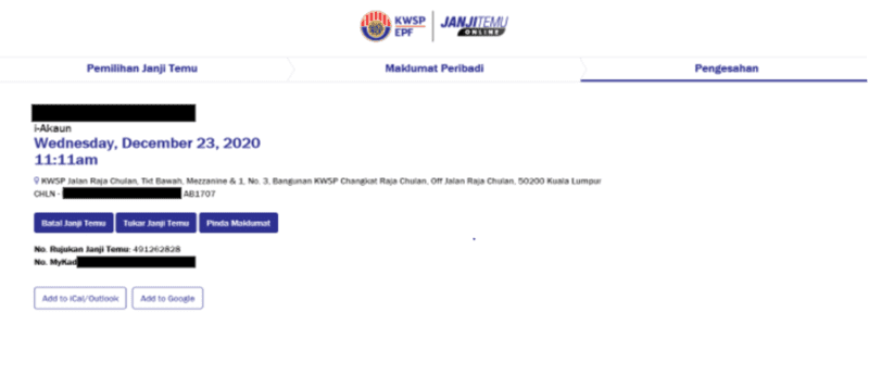 - Ahli boleh menukar tarikh atau membatalkan temu janji. Caranya mudah je, cuma klik pada pautan yang diberikan di dalam e-mel atau SMS yang diberi KWSP, dan tukar atau batalkan temu janji korang.