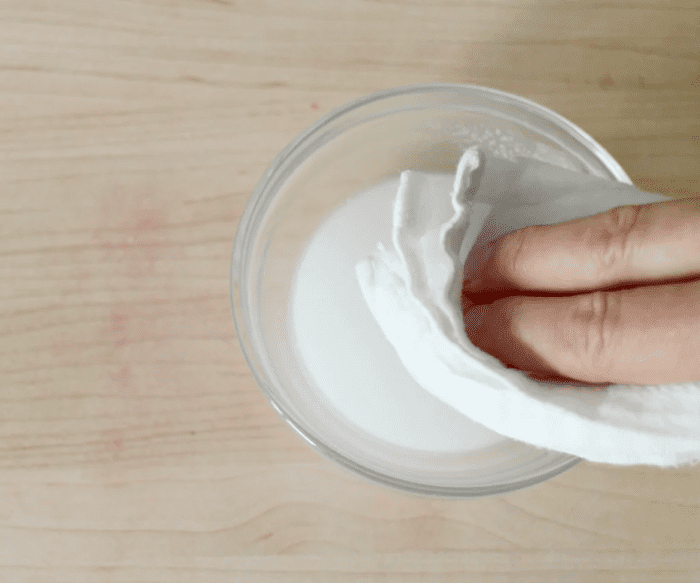 - Celupkan kain bersih yang kering ke dalam pes tersebut dan gosokkan permukaan papan pemotong untuk menghilangkan sisa kotoran. Kalau papan pemotong korang diperbuat daripada kayu, pastikan korang menggosok mengikut arah urat kayu tersebut.