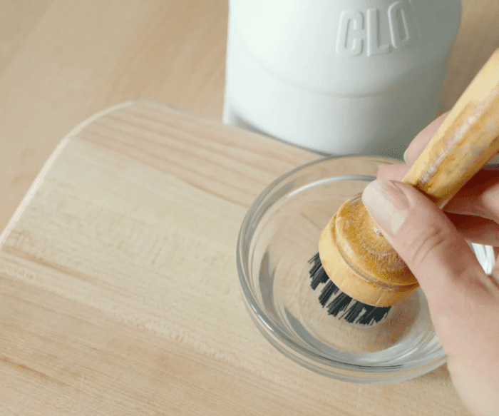 - Dengan menggunakan berus keras (berus sabut pun boleh digunakan), celup ke dalam campuran peluntur dan air tadi dan mula memberus seluruh permukaan papan pemotong sehingga bersih.