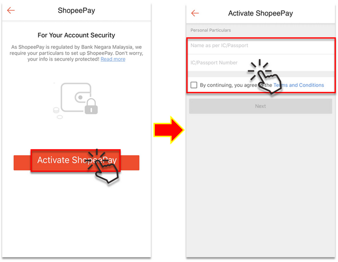 - Kemudian klik pada ‘Activate ShopeePay’, dan masukkan nama penuh seperti di kad pengenalan dan nombor kad pengenalan, dan e-wallet ShopeePay korang akan aktif.