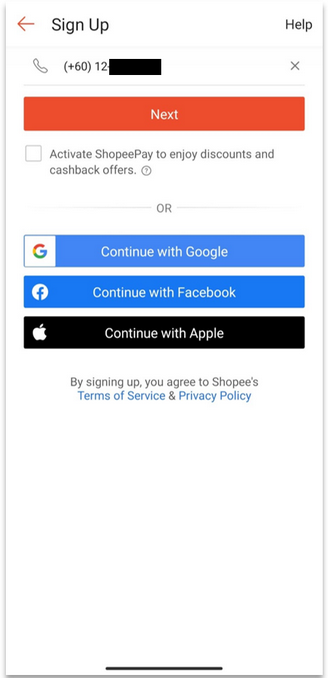 - Pendaftaran menggunakan nombor telefon ialah cara yang paling mudah, tapi korang juga boleh daftarkan akaun Shopee korang melalui akaun Google, Facebook atau Apple, dan cara pendaftarannya lebih kurang sama seperti di atas.