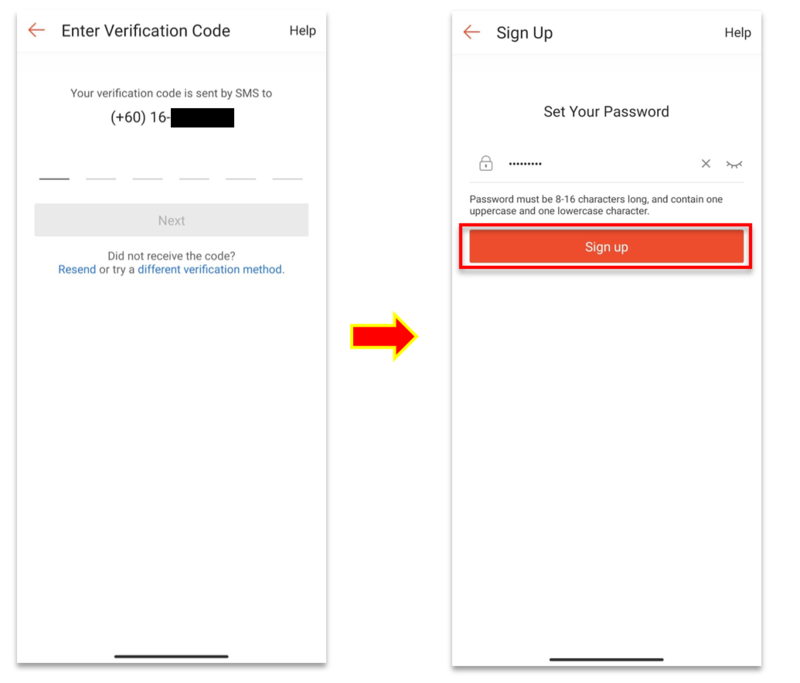 - Kemudian, korang akan dapat sms dari pihak Shopee yang mengandungi verification code sebagai pengesahan pendaftaran korang. Masukkan kod tersebut kemudian tekan ‘Next’. Selepas itu, tetapkan kata laluan yang korang nak untuk akaun tersebut, dan tekan butang ‘Sign Up’. Ingat, kata laluan korang mestilah 8 hingga 16 huruf kecil dan huruf besar.
