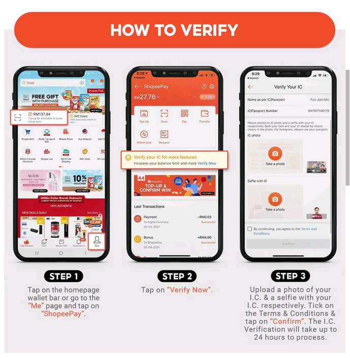 - Buat pengesahan verifikasi kad pengenalan dengan muat naik gambar kad pengenalan dan selfie bersama kad pengenalan di aplikasi Shopee(pengesahan oleh Shopee akan mengambil masa 24 jam)