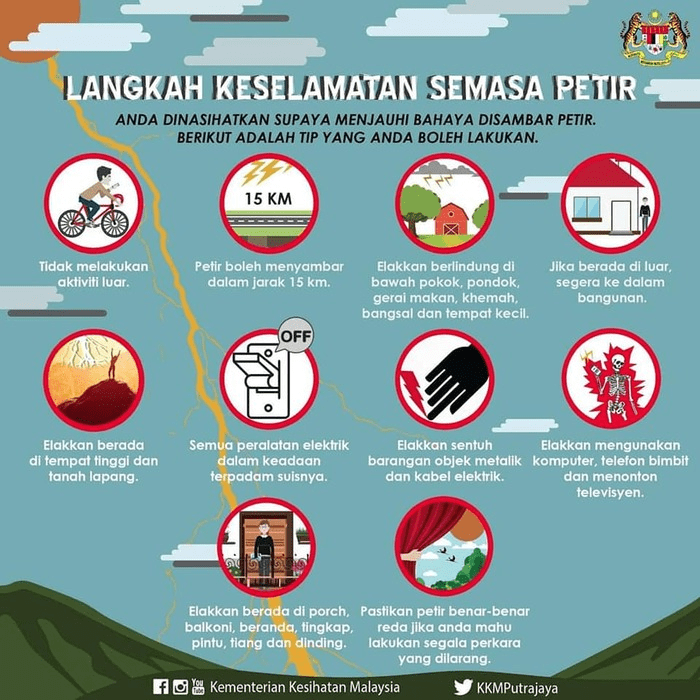 Kalau korang perasan langit dah gelap dan guruh pun kedengaran, cepat-cepatlah cari tempat berlindung. Walaupun hujan belum turun, petir masih boleh menyambar ke bumi. Tempat perlindungan paling selamat adalah di dalam bangunan. Tapi kalau tak ada bangunan berdekatan, korang boleh berlindung di dalam kereta. Tapi kereta pun kalau di tengah lapang boleh disambar petir juga! Hati-hati.