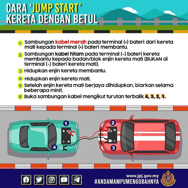 Semasa ingin memulakan jump start kereta, ikuti langkah berikut: