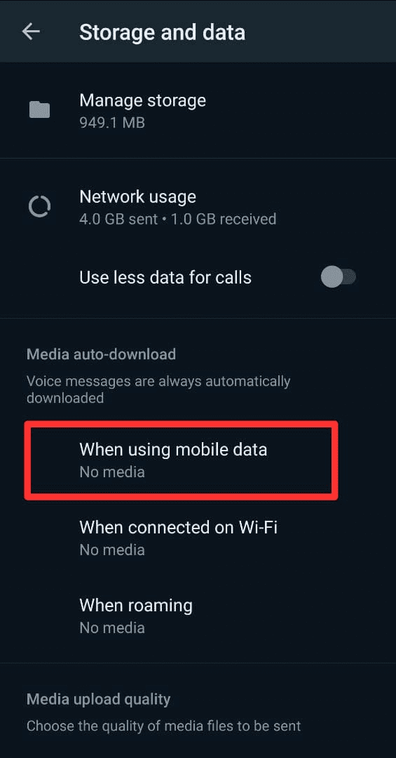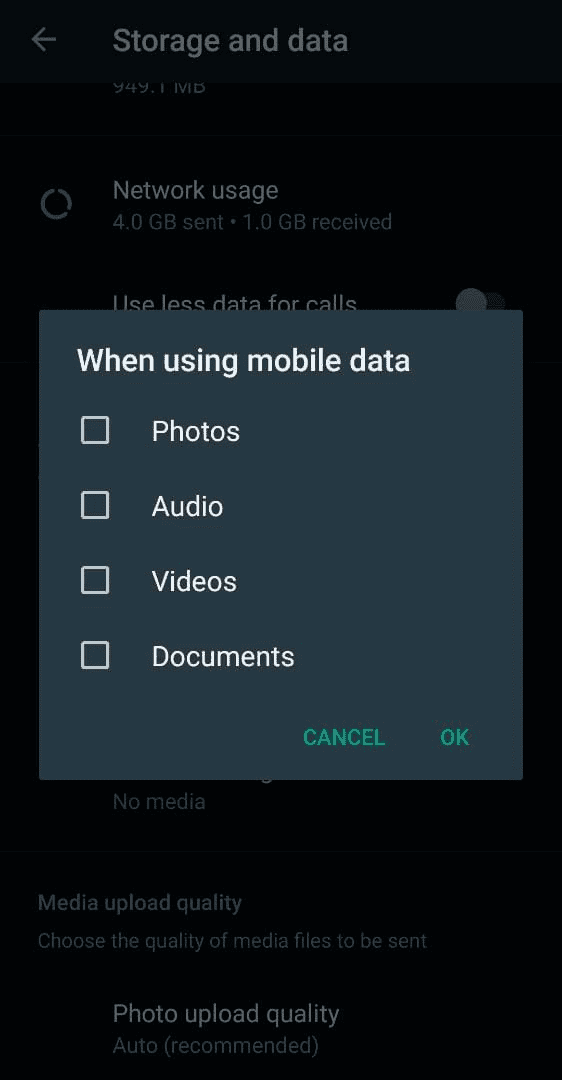 - Pilih when using mobile data & when connected on WIFI, kosongkan tanda pada kotak Photos, Audio, Videos & Documents