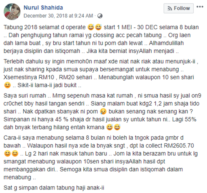 Beliau juga berkongsi dah nak masuk tahun baru ni marilah kita berazam baru untuk semangat dalam menabung. Walaupun 10 sen sehari InshaAllah hasilnya dapat membanggakan diri nanti. Duit tersebut juga akan disimpan dalam tabung haji anaknya, kan bermanfaat tu. Daripada dah nak pakai duit baru mencari, eloklah kita menabung dulu jadi tak terdesak dan terpaksa berhutang pula dengan orang kan dah susah macam tu, jadi sendiri mahu ingat lah kan.