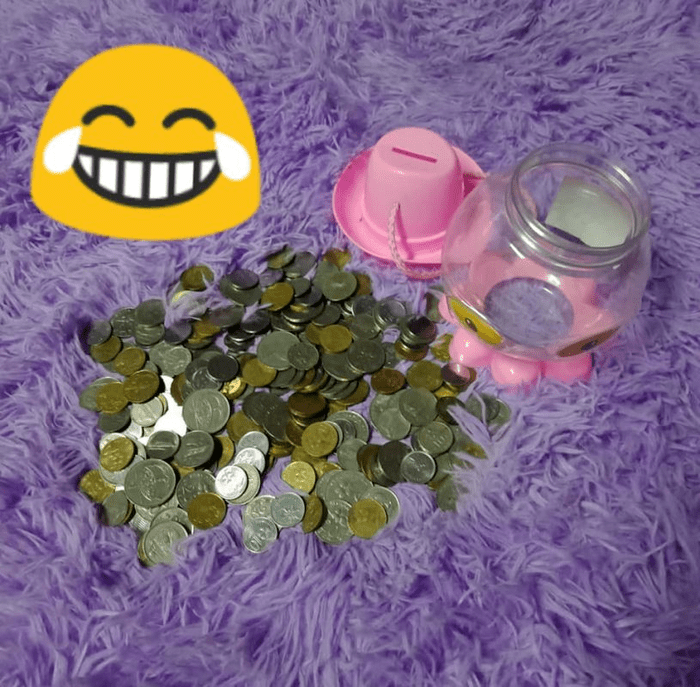 Tabung ini mungkin agak jenuh sikit nak kira. Lepastu setiap kali nak penuh ada je yang akan pergi tukar kat kedai ikan, kedai runcit ke jadi dah hampir RM200 lebih juga jumlah dah ditukar. Maka baki yang terumpul tu tinggal ni je: