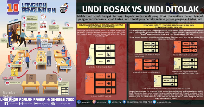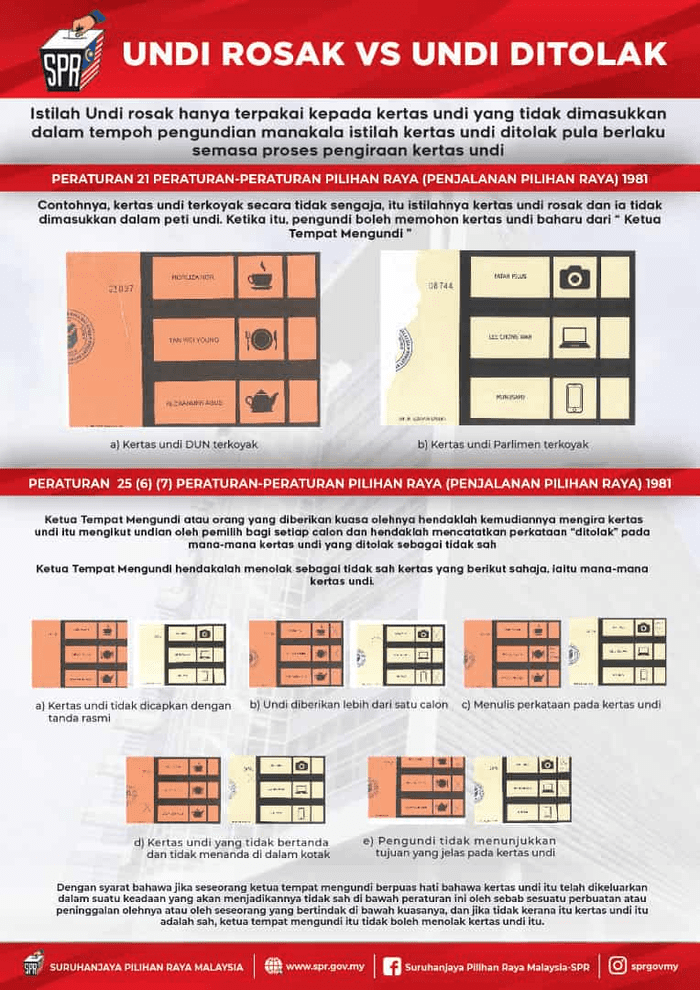 Penjelasan lanjut mengenai contoh kertas undi rosak dan kertas undi ditolak adalah seperti di dalam infografik yang dikongsikan SPR di bawah: