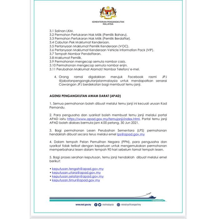 Sebagai makluman, urusan yang dibolehkan untuk berurusan di kaunter JPJ sepanjang tempoh PKP Fasa 1 adalah seperti berikut (sehingga dimaklumkan) :