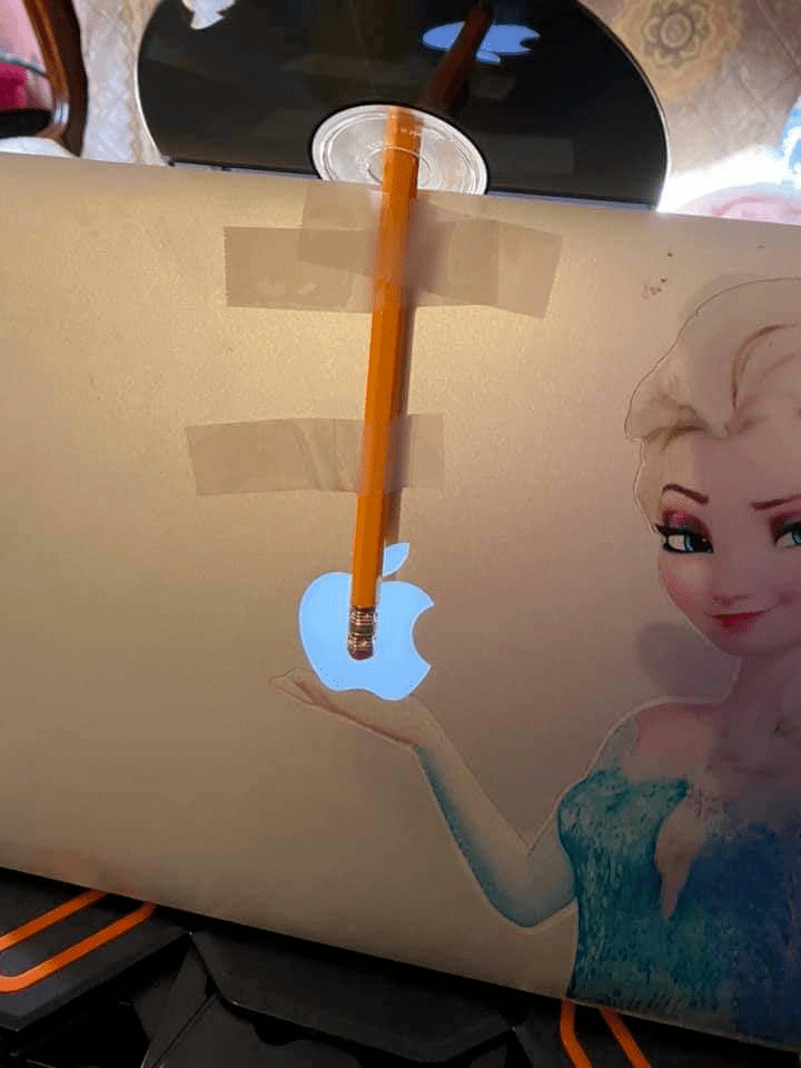 - Ambil sebatang pensil dan tampalkan di belakang komputer dengan selotape, masukkan sekeping CD (di tengah lubang CD) ke dalam batang pensil tersebut.