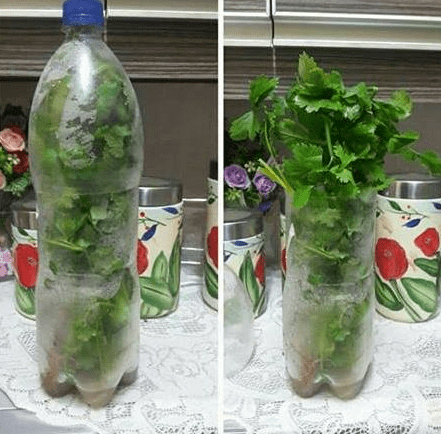 - Masukkan daun-daun ni ke dalam botol yang berisi sedikit air. Kita nak rendamkan akarnya je dan masukkan ke dalam peti sejuk.
