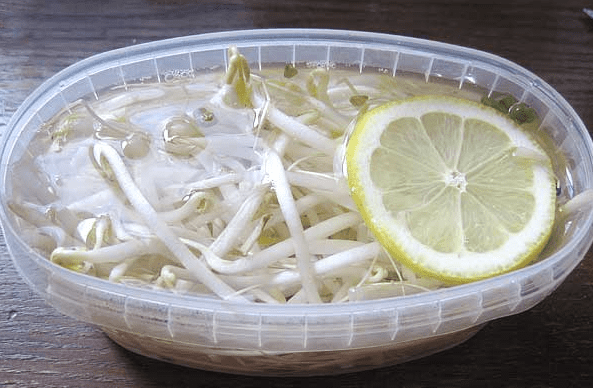- Rendamkan tauge di dalam bekas berisi air. Perahkan jus lemon dan letakkan juga beberapa hirisan lemon.