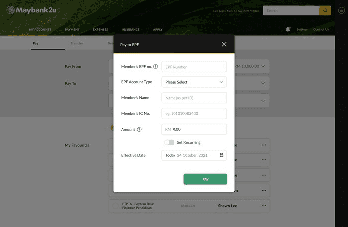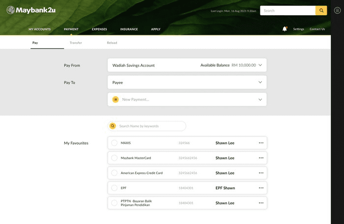 2. Klik tab ‘Pay’ dan pilik untuk bayar kepada ‘Payee’