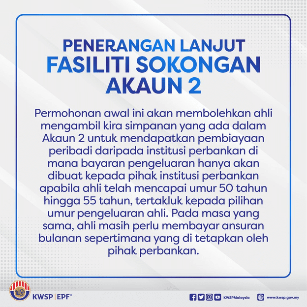 “Memandangkan ia adalah pinjaman yang dibuat dengan pihak bank, ahli perlu membuat bayaran semula secara bulanan kepada pihak bank berkenaan. Amaun yang dimohon akan diasingkan ke dalam akaun khas sehingga anda mencapai umur 50 tahun. Sekiranya pada umur 50 Tahun, pembiayaan anda dengan pihak bank telah selesai, amaun Akaun 2 anda yang diasingkan akan dikembalikan ke Akaun 2 anda dan layak untuk Pengeluaran Umur 50 Tahun”