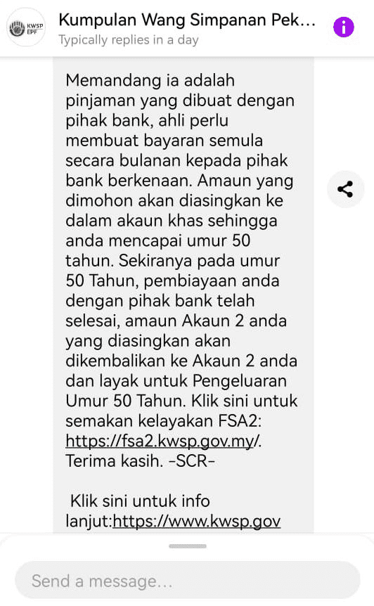 Jawapan melalui soalan lazim FSA2 KWSP adalah seperti berikut: