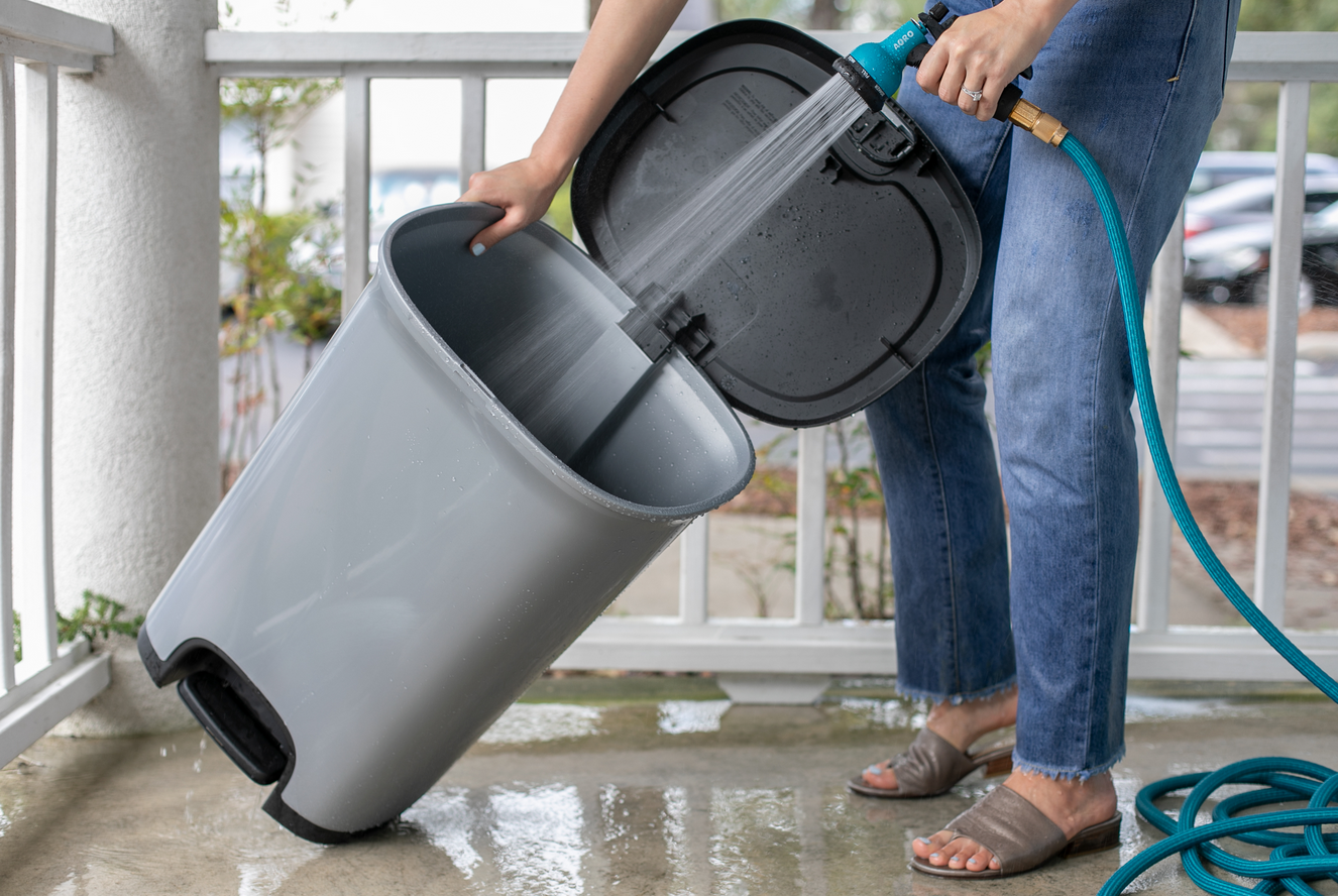 - Bilas tong sampah dengan air, paling baik jika disembur dengan air bertekanan tinggi sehingga bersih.