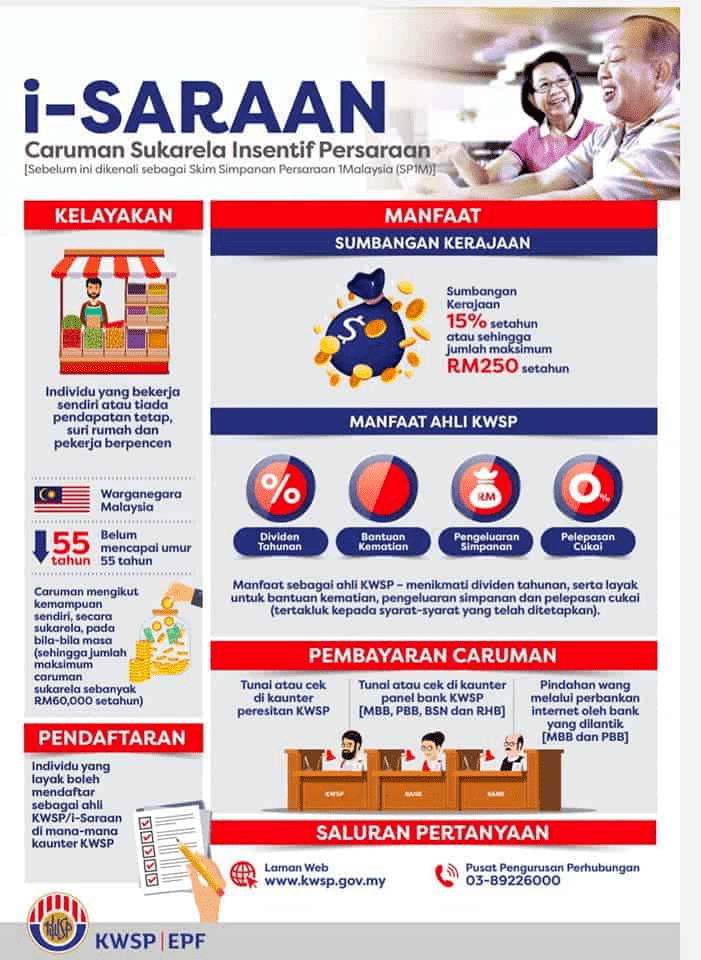 Ramai yang bising kalau tak kerja atau pun kerja sendiri boleh ke carum KWSP, sebenarnya boleh daftar i-saraan KWSP. Kumpulan Wang Simpanan Pekerja (KWSP) telah pun menyediakan skim caruman secara sukarela dengan insentif persaraan. Sebelum ini ianya dikenali sebagai Skim Simpanan Persaraan 1Malaysia (SP1M). Orang ramai yang tak bekerja mahupun bekerja sendiri digalakkan mengambil peluang baik ini.