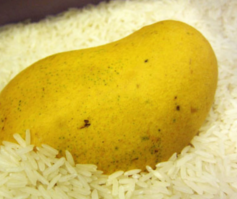 Masukkan buah tersebut di dalam bekas kedap udara, isi bekas tersebut dengan beras. Pastikan beras betul-betul meliputi buah tersebut. Beras membantu untuk memerangkap gas ethylene yang dilepaskan buah tersebut, membantu buah tersebut untuk masak dengan lebih cepat. Bekas kedap udara pula menghalang gas tersebut dari terlepas keluar. Korang boleh periksa buah tersebut kebiasannya selepas 3-4 hari.