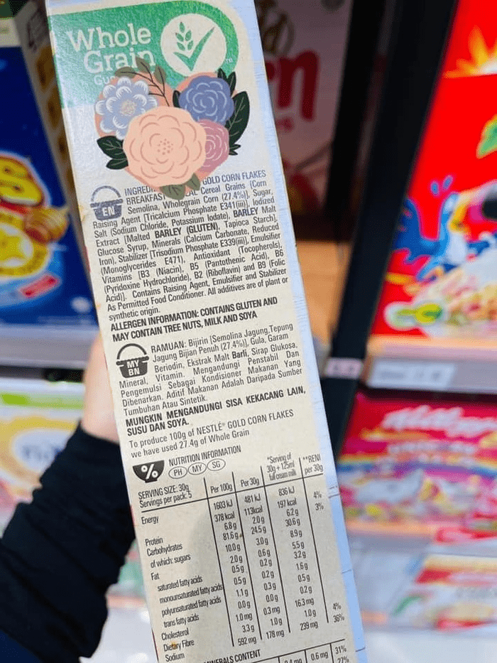Makanan bijirn atau cereal ini lazimnya bersumberkan dari bahan GMO. Kandungan lain yang terdapat di dalamnya juga termasuklah pengawet dan pewarna tiruan.