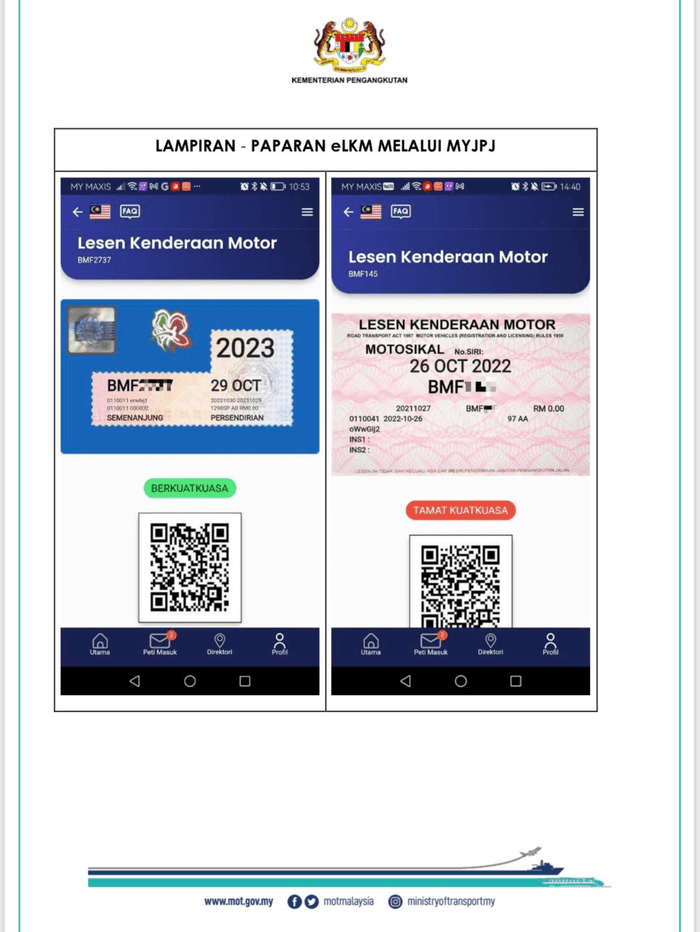 Terkini pada 10 Februari 2023, kerajaan menerusi Kementerian Pengangkutan Malaysia (MOT) telah mengumumkan bahawa bermula daripada hari ini, pemilik kenderaan persendirian yang merupakan warganegara boleh menggunakan mod paparan Lesen Kenderaan Motor LKM digital (e-LKM) dan Lesen Memandu Malaysia Digital (e-LMM) menerusi Aplikasi Mobile MyJPJ atau melalui Portal Awam JPJ.