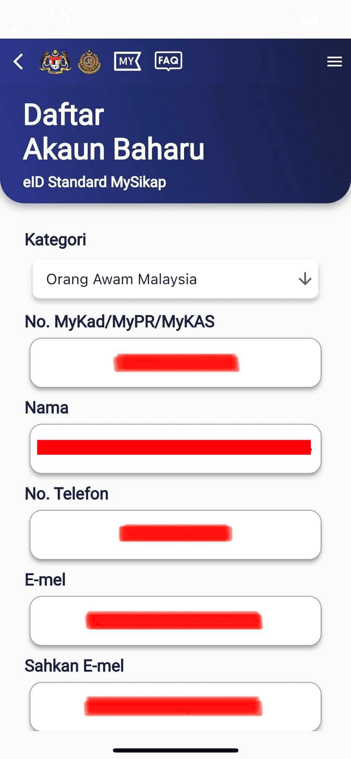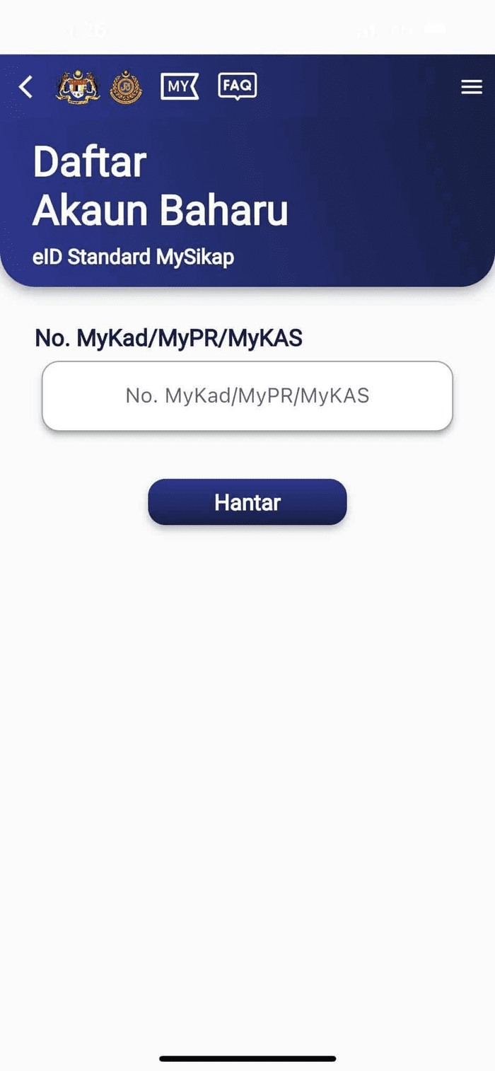 - Sekiranya ID yang dimasukkan masih belum didaftarkan, pengguna akan terus ke paparan “Daftar Akaun Baharu”