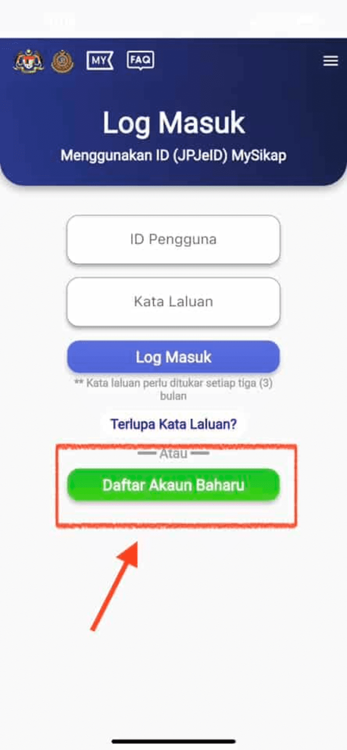 - Buka aplikasi MyJPJ pada paparan Log Masuk, klik pada butang “Daftar Akaun Baharu” untuk mendaftar ID pengguna baharu