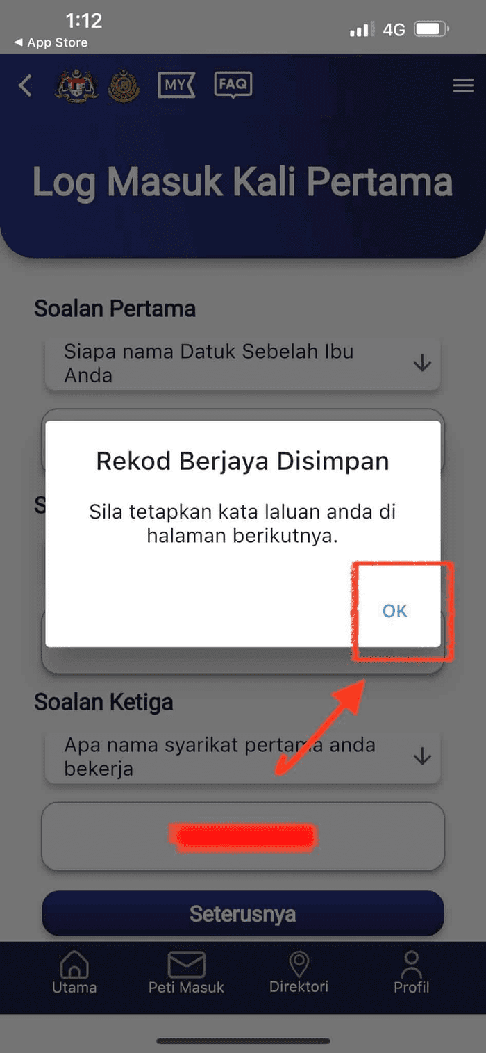 - Mesej pop-up akan dipaparkan “Rekod Berjaya Disimpan”. Sila tetapkan kata laluan pada halaman seterusnya”. Klik “OK” untuk ke laman Penetapan Kata Laluan.