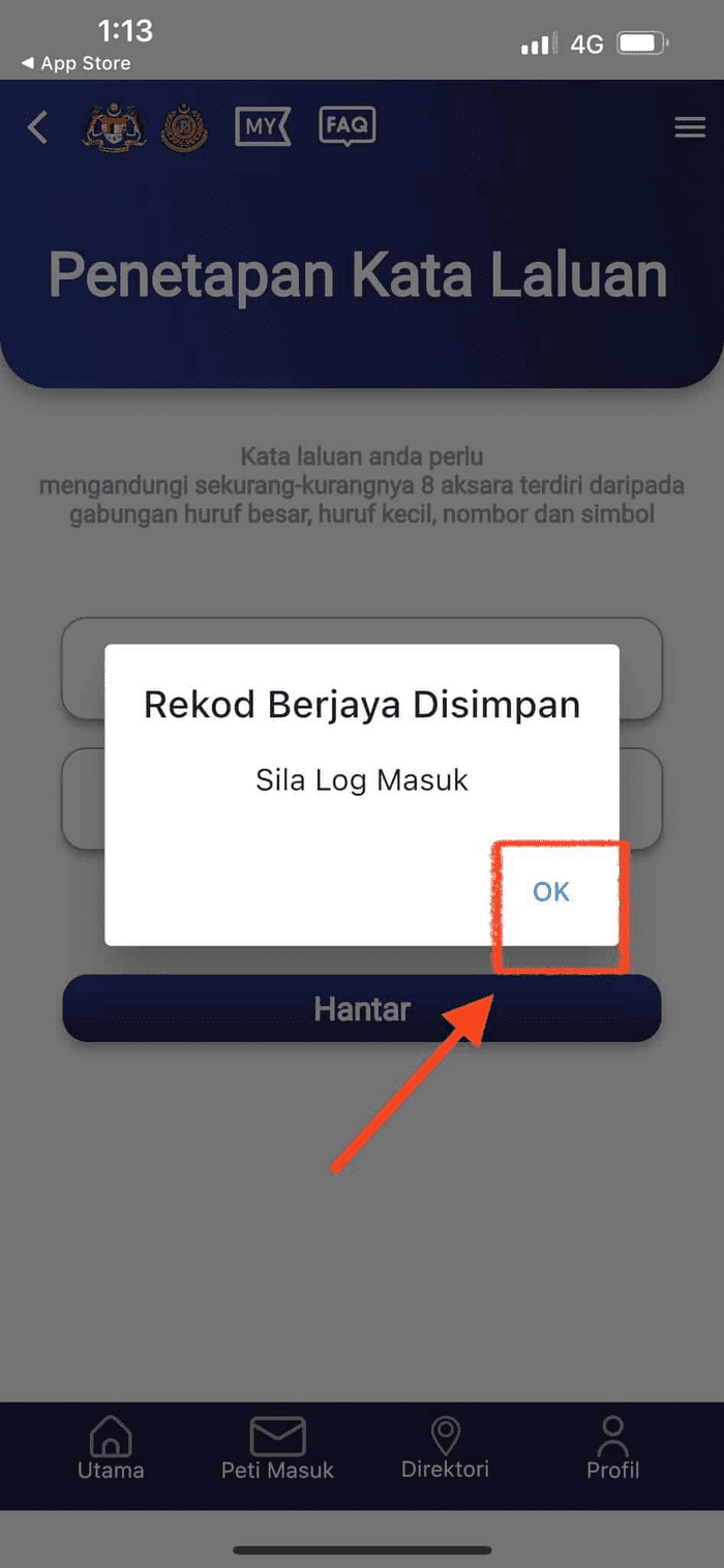 - Paparan mesej “Rekod Berjaya Disimpan, Sila Log Masuk” akan ditunjukkan. Klik pada “OK” di bahagian bawah mesej untuk kembali ke laman Log Masuk.