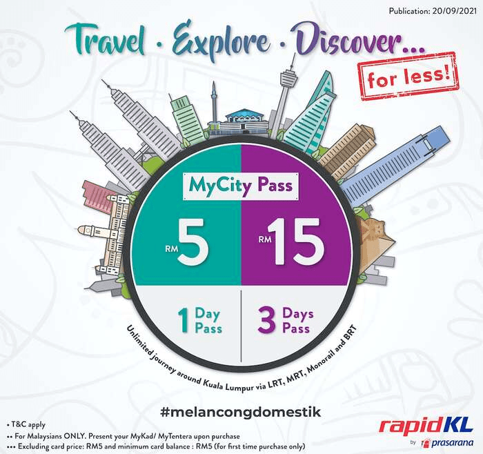 MyCity Pass ini meruparakn pas perjalanan yang ditawarkan hanya kepada rakyat Malaysia bagi penggunaan tanpa had untuk rel Rapid KL termasuklah LRT, MRT, Monorel dan rangkaian BRT selama 1 hari atau 3 hari. Ianya adalah berdasarkan kiraan kitaran hari, dan boleh membeli pas pada bila-bila masa sepanjang bulan. Namun ianya terhad kepada Warganegara sahaja. Sangat berbaloi sebab boleh beli hari-hari mana yang kita nak kan? Waktu cuti sekolah pun bagus guna benda ni.