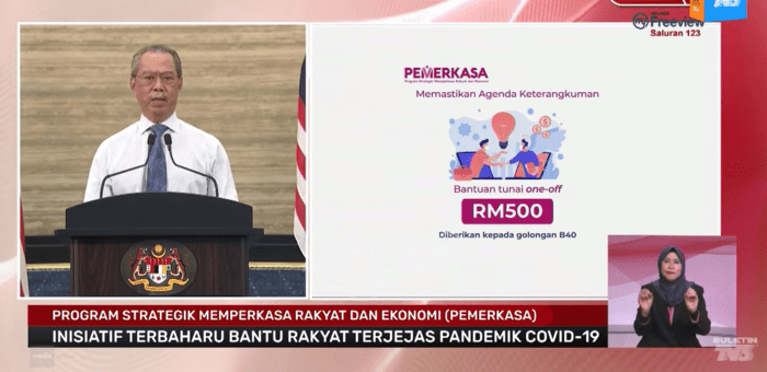 - Bantuan tunai sebanyak RM500 secara one-off diberikan kepada Golongan B40 yang telah hilang pendapatan