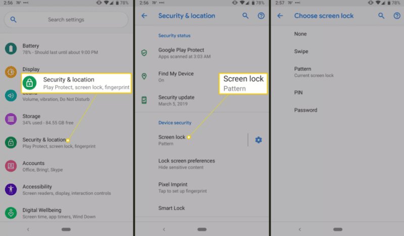 - Tap pada Security & Location > Screen Lock. (Sesetengah telefon Android, Security & Location adalah Security & Privacy)