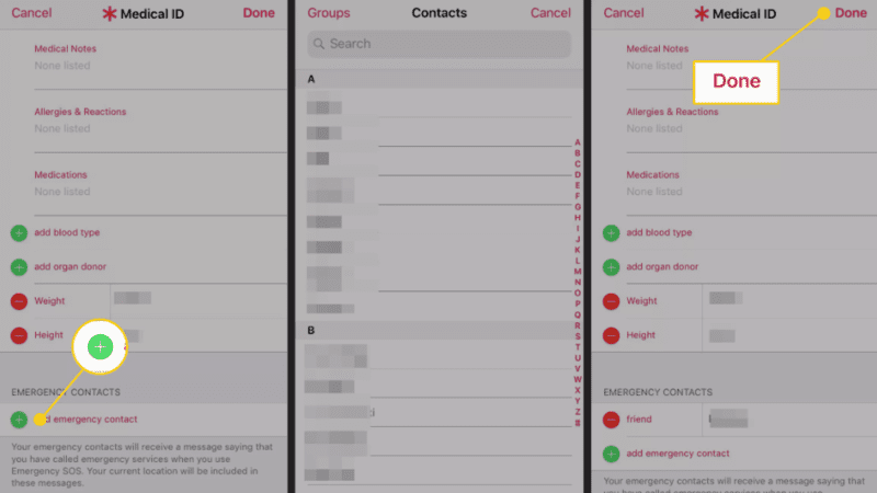 - Kemudian, tap Add Emergency Contact di bahagian bawah skrin, dan pilih mana-mana nombor telefon yang korang mahu jadikan sebagai nombor kecemasan. Lepas tu, pilih Done.