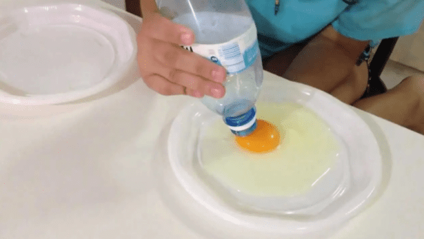 Kalau tak ada senduk berlubang, korang boleh juga gunakan botol mineral kosong. Picit botol dan letakkan mulut botol dekat dengan telur kuning dan perlahan-lahan lepaskannya. Kuning telur akan tersedut masuk ke dalam botol.