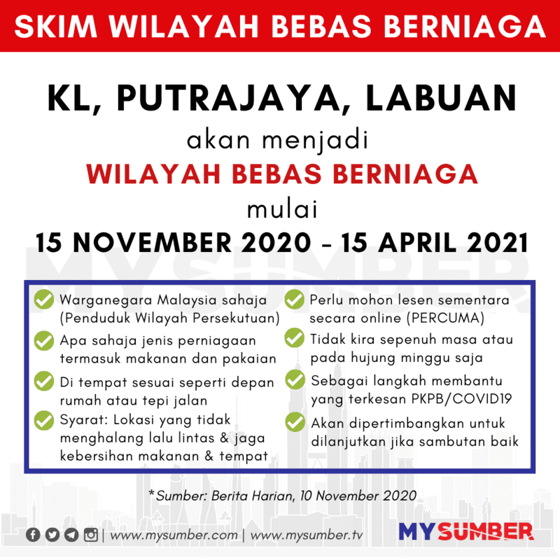 Kalau korang tinggal di Wilayah Persekutuan KL, Putrajaya dan Labuan, baru-baru ini Menteri Wilayah Persekutuan dah pun benarkan semua orang untuk membuka gerai di mana-mana kawasan yang sesuai di Wilayah Persekutuan dan korang tak perlu bayar pun untuk permit meniaga sehingga 15 April tahun depan. Boleh mohon secara percuma di pejabat cawangan pihak berkuasa tempatan masing-masing ataupun nak mohon secara online pun boleh. Jangan risau kalau apa yang dijual tak laku, sebab sekarang ni korang boleh jual online juga. Hanya daftar di grabfood atau foodpanda ataupun boleh buat delivery sendiri.