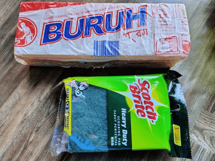 Dah ada sabun tu, boleh lah mulakan aktiviti menyental kuali untuk buangkan segala jenis hitam di kuali tu. Confirm berkilat balik ni!