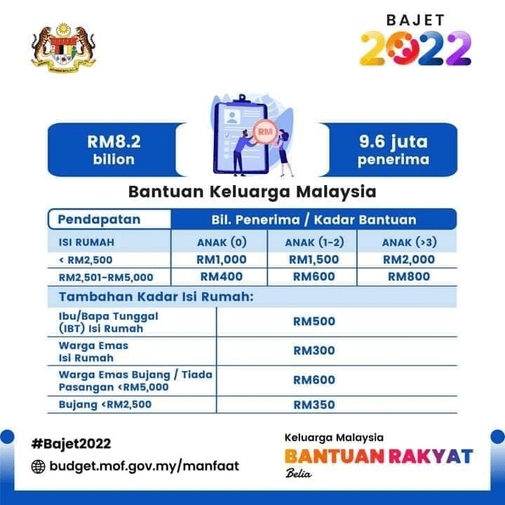 Pada tahun 2022 pula, Bantuan Keluarga Malaysia (BKM) telah menggantikan Insentif kewangan Bantuan Prihatin Rakyat (BPR) pada tahun sebelum ini. Bagi mereka yang telah menerima Bantuan BPR tidak perlu membuat sebarang permohonan baru. Penerima hanya perlu kemaskini dan membuat semakan jika ada sebarang perubahan maklumat jika perlu. Peruntukan BKM ini adalah sebanyak RM8.2 billion.