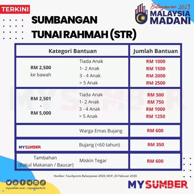 Sumbangan Tunai Rahmah (STR) telah pun dibuat secara berperingkat dan sedikit sebanyak memberi kelegaan buat rakyat. Jumlah tertinggi bagi bantuan ini adalah sehingga RM2,5000. Apa yang menarik lagi adalah bagi penerima miskin tegar, mereka layak menerima bantuan tambahan berupa bakul makanan sehingga RM600.